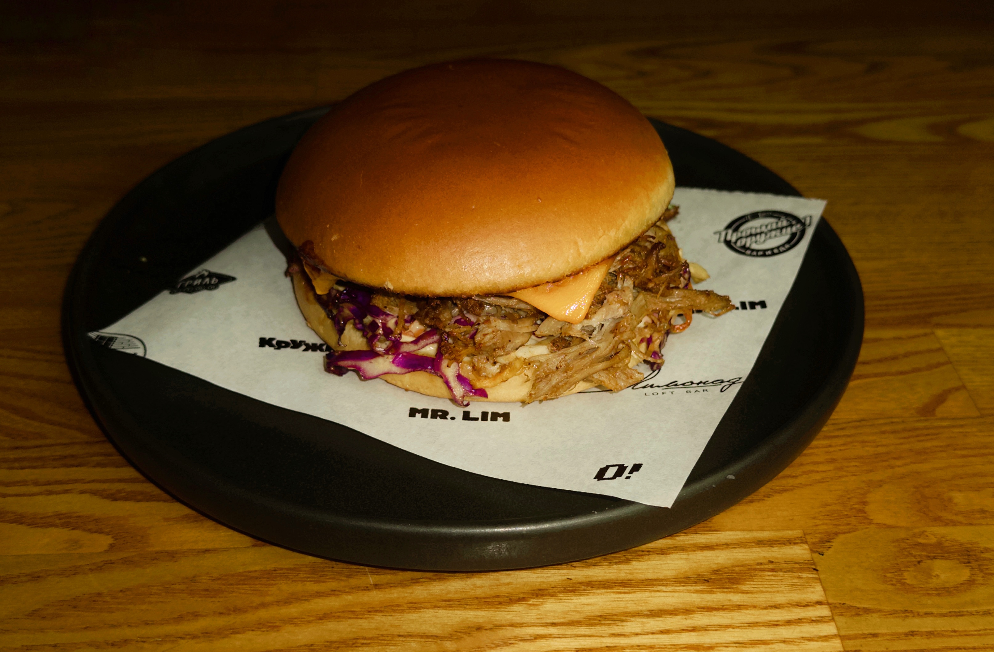 Булочка картофельная, свинина рваная, сыр чеддер, коул слоу (капуста пекинская, капуста краснокочанная, огурцы, морковь, майонез, соус терияки, имбирь молотый, чеснок сушёный, перец чёрный молотый, соль), масло сливочное, кетчуп, соус барбекю, лук фри, соль