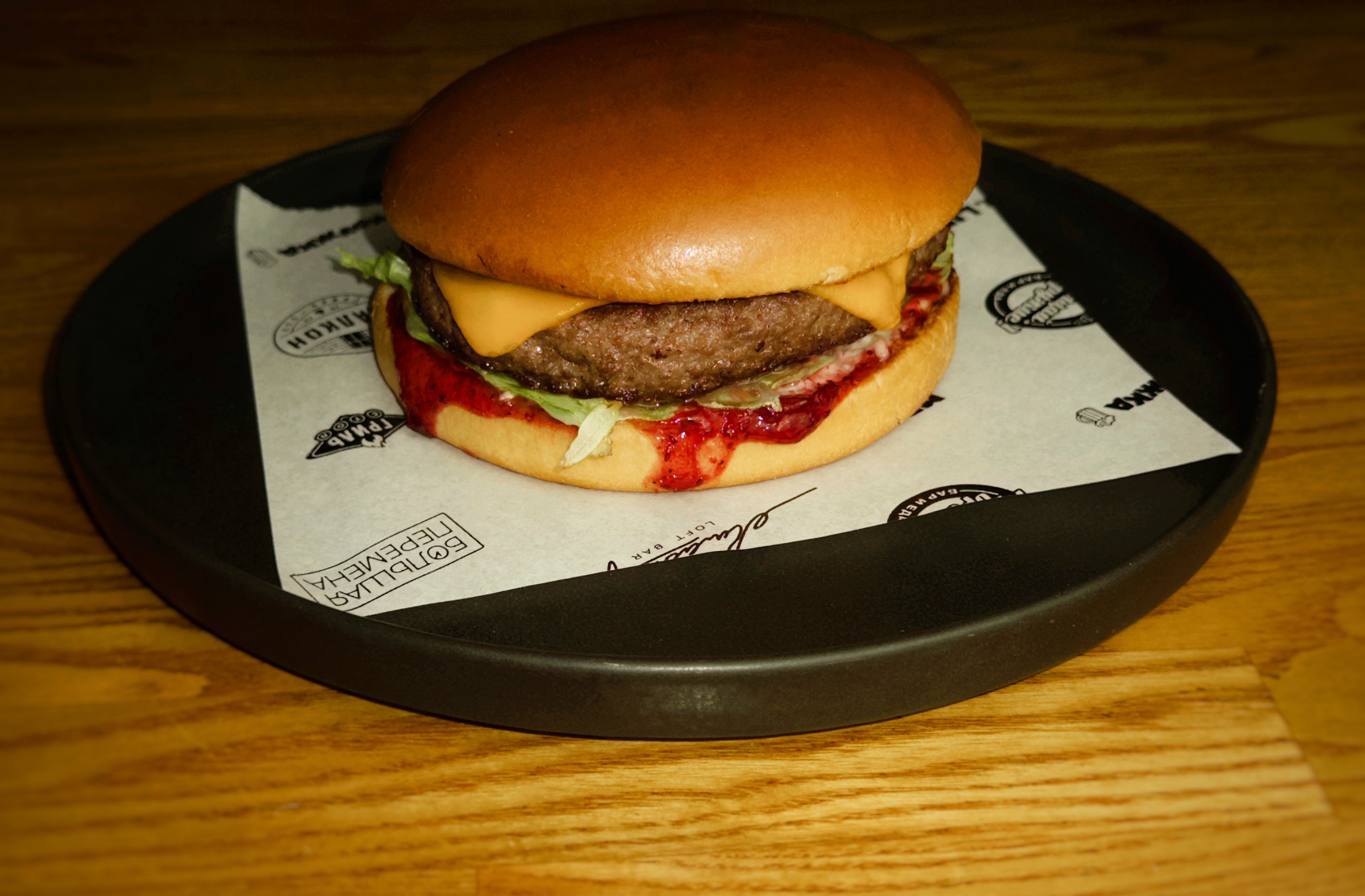 Вкусный бургер с дымком BBQ - сочная котлета с овощами и сыром чеддер приправлены брусничнм соусом