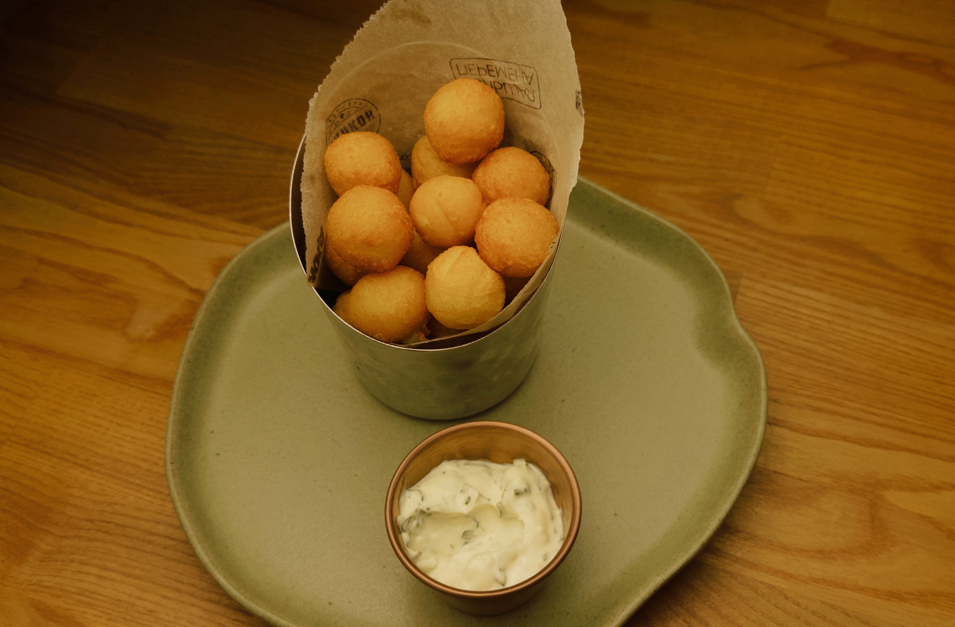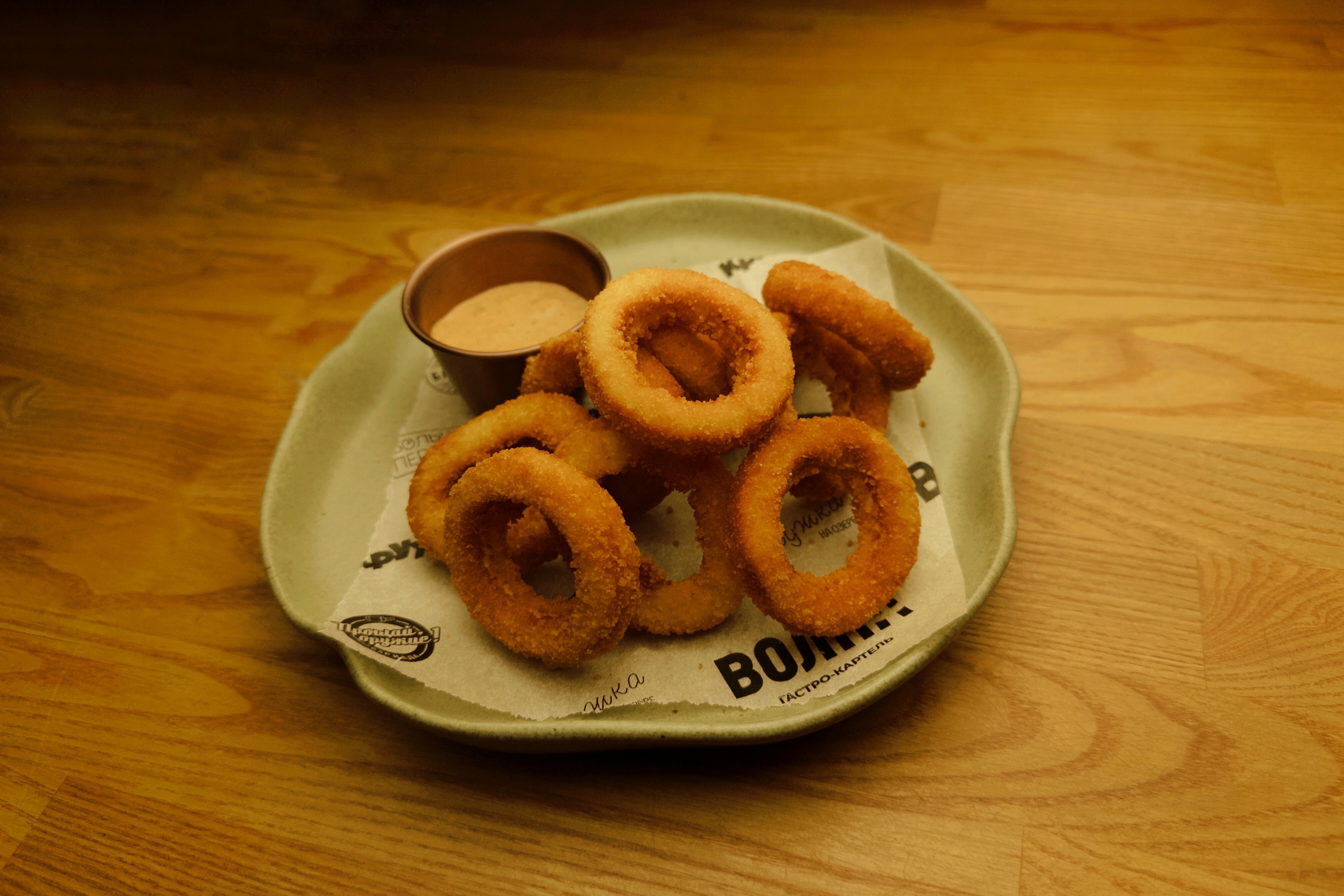 Дольки картофельные, колбаски охотничьи, свинина рваная, бекон, соус барбекю, сливки, лук красный и зелёный, сельдерей, корнишоны маринованные, лук фри