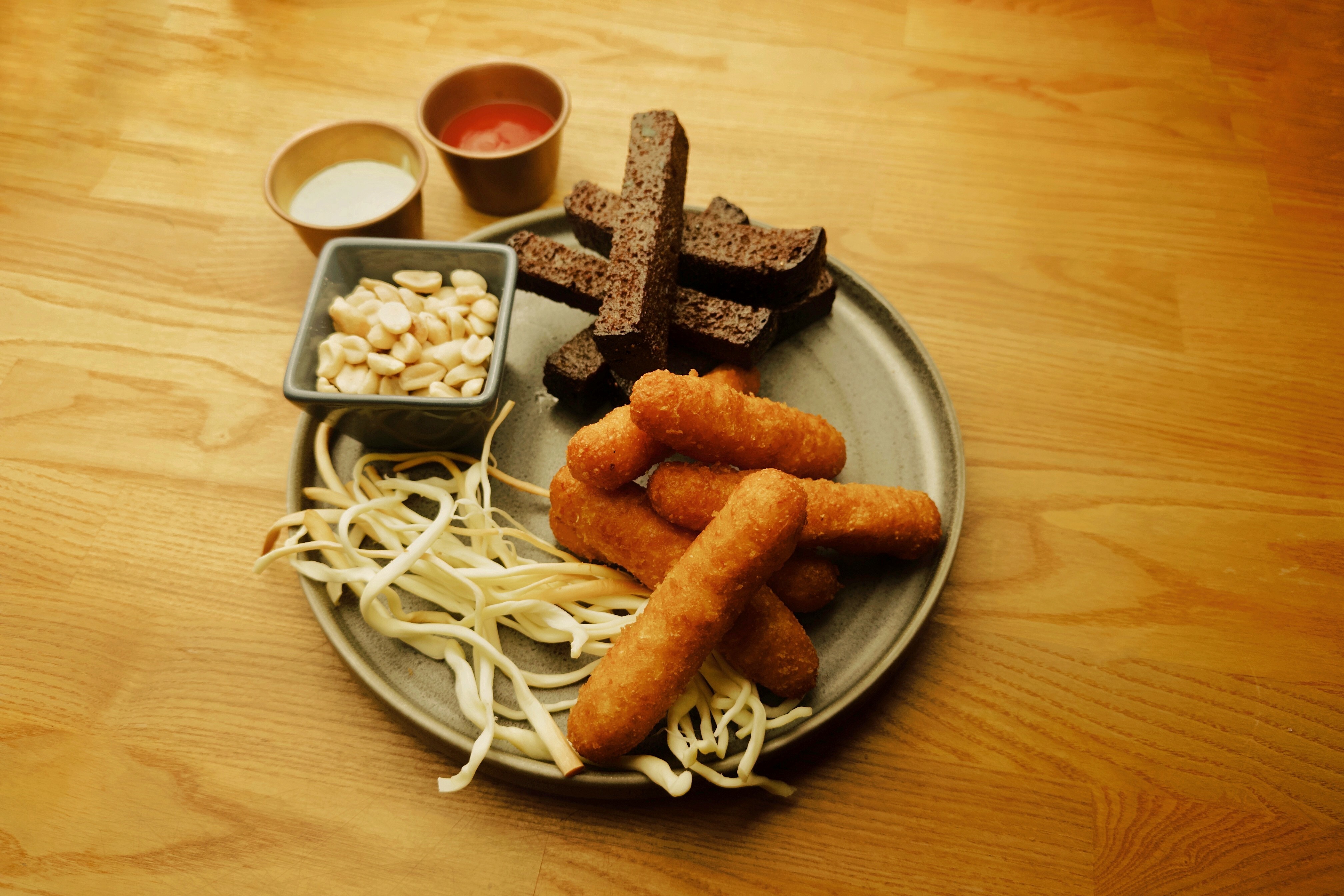 Тосты из чёрного хлеба, сыр творожный, сельдь солёная, лук зелёный